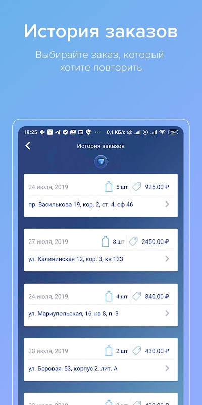1. Оформить заказ просто и удобно: выбрав марку воды и количество, указав телефон и имя, а также желаемую дату и время доставки. Заказ автоматически сохраняется в памяти мобильного устройства, в случае, если он не был до конца оформлен.