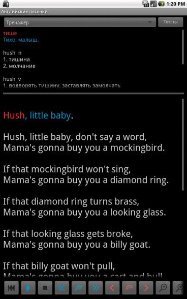 Программа даёт возможность прослушивать отдельные слова, фразы и песню целиком, предоставляя переводы слов и фраз. Управлять программой можно с помощью панели кнопок, расположенной под текстом песни, или следующими жестами: