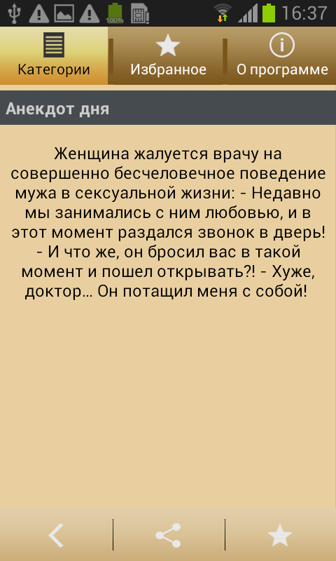 Приложение имеет широкий выбор возможностей распространение анекдотов – ВКонтакте, Facebook, Twitter и другие. Стоит Вашим друзьям прочесть сообщения на Вашей странице и они будут приятно удивлены.