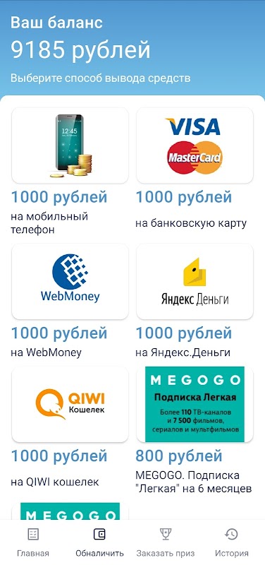 - Rút tiền vào thẻ, điện thoại và ví điện tử với mức tích lũy 1000 rúp;
