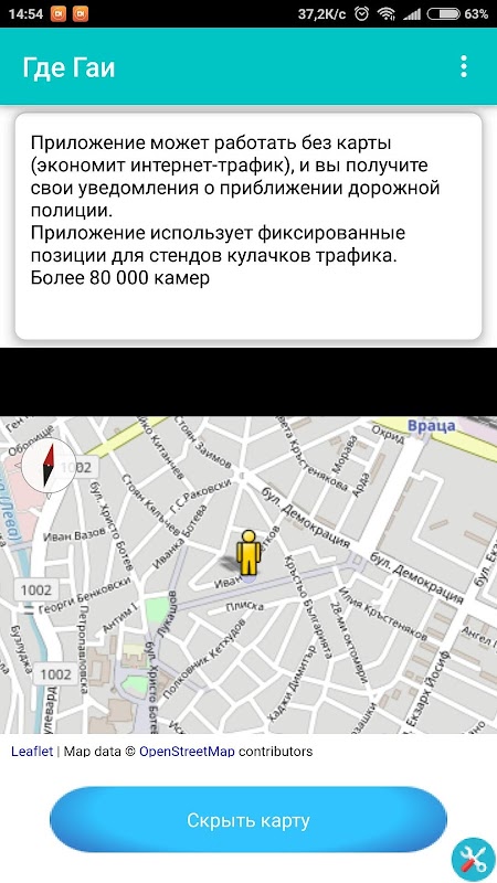 Где ГАИ — это бесплатная онлайн карта постов ГАИ и ГИБДД. Если Вы хотите всегда знать, где стоят инспекторы дорожно-патрульной службы, то именно это приложение придет Вам на помощь. Приложение может работать без карты (экономит интернет-трафик), и вы получите свои уведомления о приближении дорожной полиции. Приложение использует фиксированные позиции для стендов кулачков трафика. Более 8 000 камер.