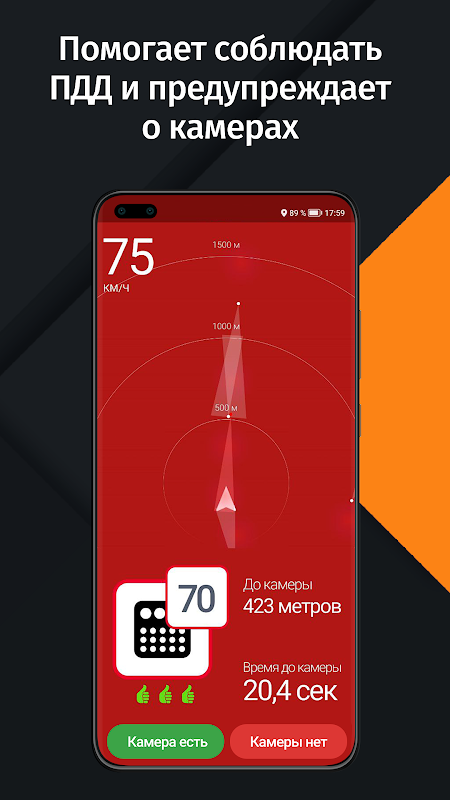 Nếu tốc độ của bạn vượt quá tốc độ cho phép hơn 19 km / h khi đến gần camera, ứng dụng sẽ phát âm thanh cảnh báo. Và điều này rất quan trọng, bởi vì bây giờ tiền phạt cho việc vượt quá 20 km / h đã bắt đầu với 500 rúp.