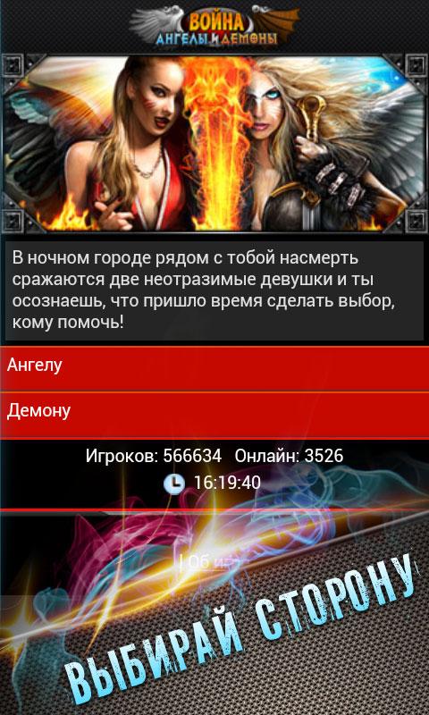 «Война: Ангелы vs Демоны» - это хит многопользовательских онлайн игр для мобильных телефонов! Увлекательный сюжет, жёсткое противостояние Ангелов и Демонов с каждым днём привлекают в ряды воинов всё больше и больше отчаянных смельчаков! Раскачай своего персонажа и поддерживай его в отличной физической форме с помощью постоянного Развития. Позаботься о снаряжении своего воина, приобретай холодное и огнестрельное оружие, запасайся исцеляющими настойками, накопи на крутую тачку и начинай активную военную деятельность!
