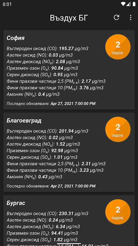 Приложението показва подробна информация за нивата на фини прахови частици и други данни за з амърсяването на въздуха в българските градове. Бързо và лесно научавате за качеството на въздуха във всеки един час.