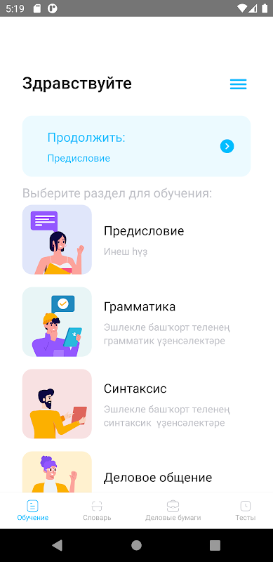 Ứng dụng di động này là một hướng dẫn học tập tương tác kết hợp thông tin lý thuyết cơ bản về khóa học ngôn ngữ Bashkir kinh doanh, văn hóa giao tiếp kinh doanh, các nhiệm vụ cho công việc độc lập và một cuốn sách tham khảo từ điển tiếng Nga-Bashkir ngắn gọn về từ vựng kinh doanh chính thức. Phần phụ lục bao gồm các mẫu giấy tờ kinh doanh thường được biên soạn trong quá trình giao tiếp kinh doanh, cũng như các hệ thống kiểm tra mức độ thông thạo tài liệu và nội quan chuyên nghiệp.