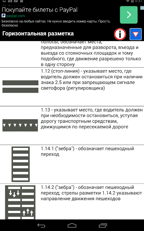 Дорожная разметка соответствует Правилам дорожного движения Российской Федерации на 2014 год и способствует эффективной подготовке к экзаменам по ПДД. Приложение состоит из трех разделов: перечень разметки и информации по ней, раздел запоминания разметки, раздел тренажер для проверки знаний разметки.