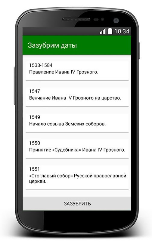 App giúp để ghi nhớ ngày tháng năm lịch sử Nga cho kỳ thi sử dụng thẻ.