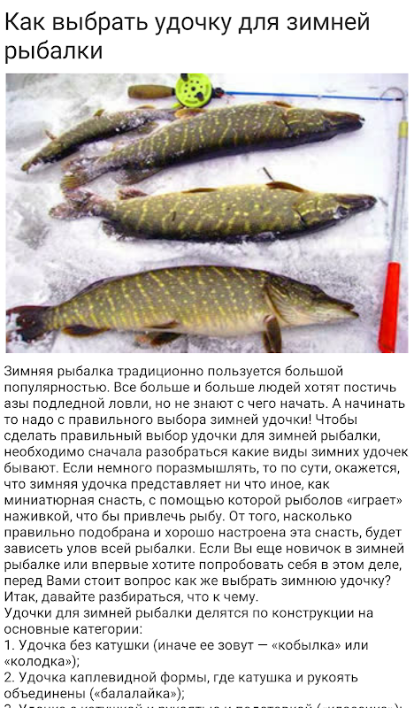 Зимняя рыбалка это особая страсть. Суть ее в том, что можно подойти к рыбе очень близко и ловить в недоступных летом местах. Как в любом виде рыбной ловли важны снасти, знания и техника. В случае с зимней рыбалкой на первом месте находится безопасность. Об этом стоит помнить всегда. При правильном подходе любители хищной рыбы в это время года могут поймать щуку, судака или окуня. Не смотря на то, что некоторые виды мирной рыбы зимой впадают в спячку - плотва, красноперка, лещ и густера продолжают активно кормиться.