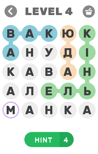 Дадзеная гульня мае 40 узроўняў, з паступовым павышэннем ўзроўню складанасці. Наша гульня з самага пачатку задае няпросты, але цікавы тэмп. Пад час праходжання гульні колькасць слоў , якiя неабходна разгадаць, будзе павялічвацца. Павялiчваюцца і памеры поля. З павышэннем узроуню, адгадваць словы становіцца ўсё складаней і складаней. Калі вы не можаце адгадаць слова, не сумуйце, бо вы заўсёды можаце "ўзяць" падказку(яна падкажа вам літары ў схаваным слове).
