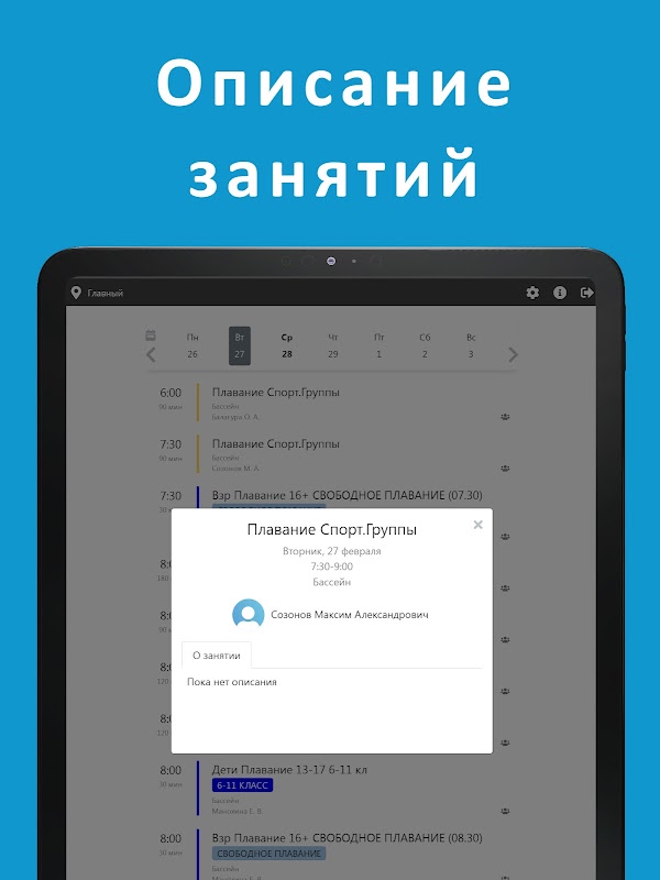 Các trường học và cơ sở thể thao của thành phố Izhevsk trong ứng dụng di động. Lịch học, đăng ký lớp học, thanh toán trực tuyến, tất cả đều có trong tài khoản cá nhân của bạn. Tải ứng dụng và luôn cập nhật.