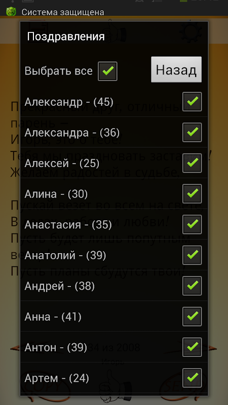 Тут большой список список всех имен в приложении и кол-во поздравлений для каждого имени: