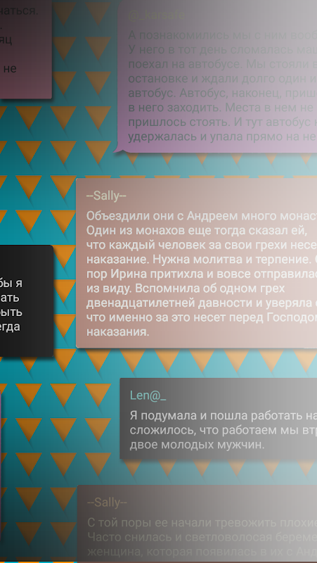 ⭕️ Все рассказы построены на внедрение читателя в диалог или монолог. Вы будто онлайн читаете мысли других людей в виде сообщений, где они описывают личные мысли, переживания, интимные события происходившие с ними.