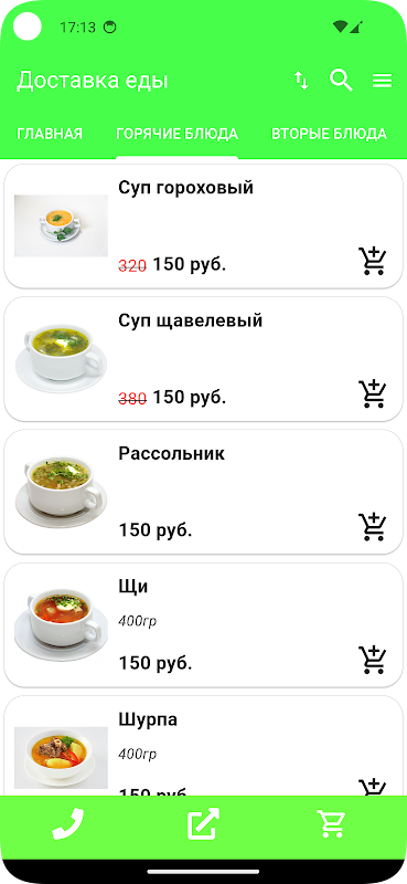 Ứng dụng đặt món ăn giao tận nhà, văn phòng. Danh mục bao gồm món thứ nhất và món thứ hai, món tráng miệng, salad và bánh ngọt. Giao hàng miễn phí.