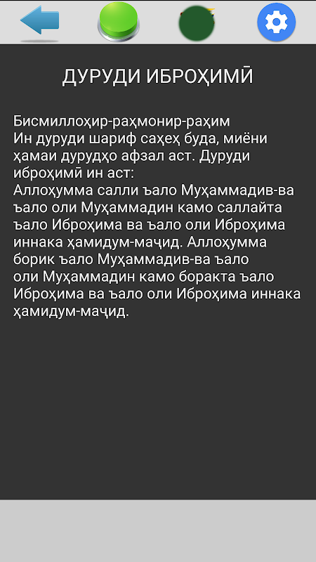 Тарҷума: Ҳар оина Худованд ва фариштагони ӯ дуруд мефиристанд бар Пайғамбар (саллаллоҳу ъалайҳи ва саллам), эй мусалмонон, дуруд фиристед бар вай ва салом гӯед салом гуфтанӣ.