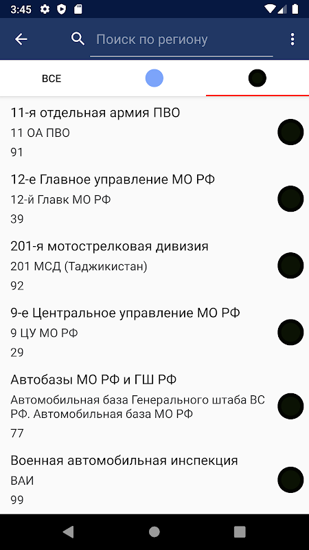 Ứng dụng này cho phép bạn xác định một khu vực ở Nga theo mã vùng trên biển số xe. Ứng dụng có thể được sử dụng để xác định khu vực theo cả biển số xe dân sự và quân sự. Bạn cũng có thể tìm kiếm mã vùng theo tên khu vực. Lịch sử tìm kiếm đã được thêm vào.