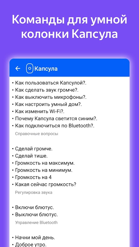 Một danh sách đầy đủ các lệnh cho trợ lý giọng nói Marusya, được phát triển bởi công ty CNTT của Nga Mail.Ru. Các lệnh được chia thành các loại.