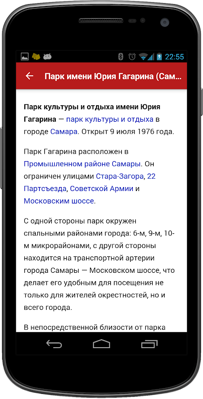 С помощью приложения вы можете узнать информацию о различных местах города (улицах, парках, площадях и т.п.), которые находятся в данный момент рядом с вами.