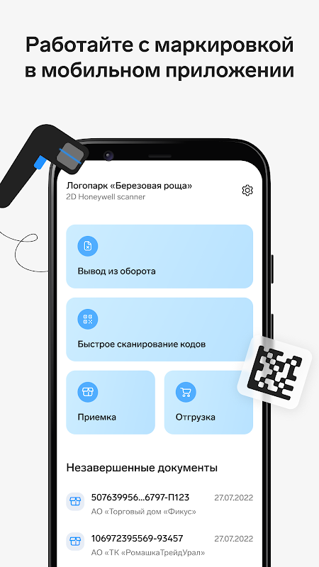 Làm việc với hàng hóa được đánh dấu bằng điện thoại thông minh hoặc TSD của bạn. Bạn sẽ có thể thực hiện việc chấp nhận và vận chuyển, cũng như loại bỏ hàng hóa khỏi lưu thông.