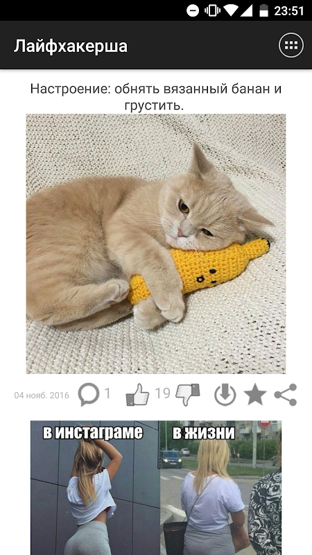 Понравившиеся записи можно комментировать и оценивать. Все понравившиеся картинки можно сохранять в галерее устройства в папке приложения. Ты можешь делиться записями с друзьями через социальные сети, а так же другие установленные на устройстве приложения. Ну и конечно, ты можешь оставлять лайки и сохранять записи в избранное.