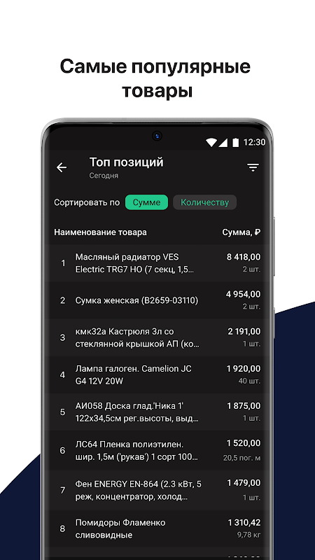 Ứng dụng này tạo danh sách các sản phẩm phổ biến nhất và hiển thị tỷ lệ thanh toán bằng tiền mặt và không dùng tiền mặt.