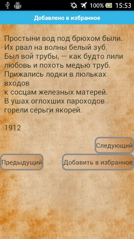 Возможность добавлять стихи и поэмы в список избранных, убирать из списка по отдельности и полностью очищать список.