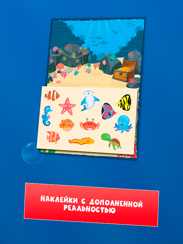 Приложение с дополненной реальностью (AR). Меткой является наклейки морских обитателей. Пользователь наклеивает наклейку морского обитателя на любую плоскость. Затем, устанавливает на свой телефон с приложение "Морские обитатели", запускает его, наводит на наклейку и получает игровую анимированную сцену дополненной реальности (AR).