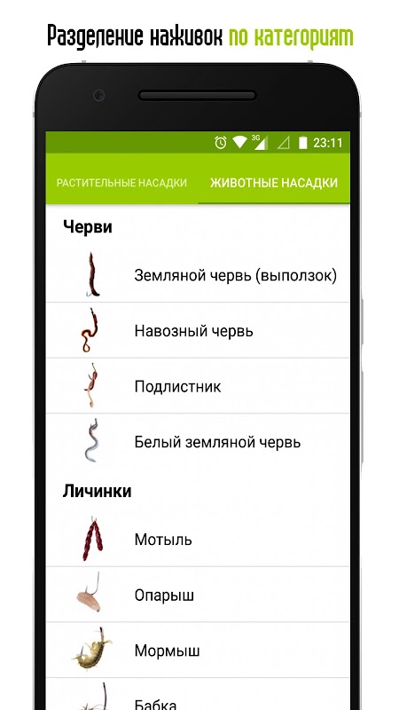 Các phụ lục cung cấp một mô tả của bả thực vật cho cá. Tất cả các bài viết được kèm theo hình ảnh. Mồi được chia thành các loại.