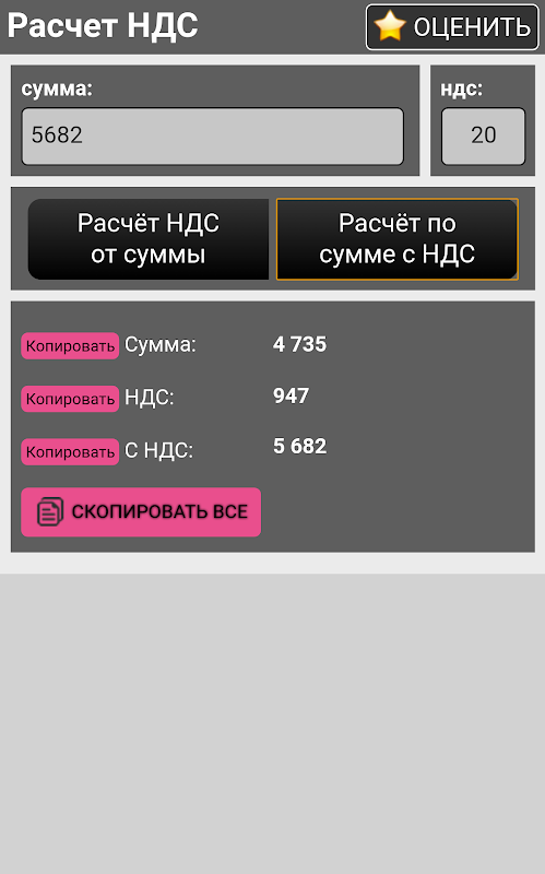 НДС — это косвенный налог, калькулятор НДС рассчитает налог на добавленную стоимость, он устанавливается в виде надбавки к стоимости товаров или услуг. Вы указываете сумму для расчета и ставку, ставка НДС 2020 года равна 20%.