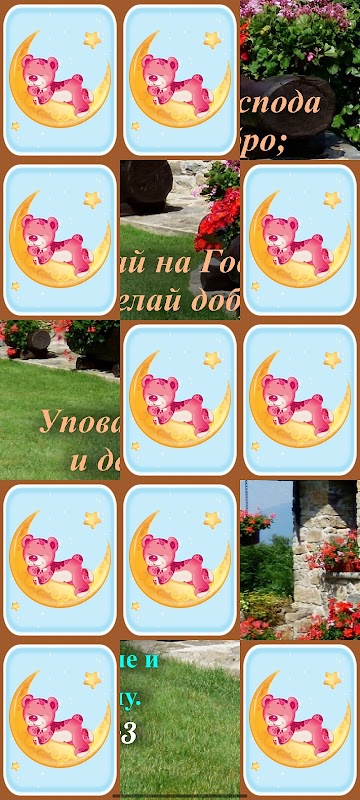 Sau mỗi câu trả lời đúng, bạn sẽ được đưa đến một màn hình nơi bạn có thể mở một bức tranh có hình khối kèm theo Lời hứa trong Kinh thánh dưới dạng một câu đố. Bạn có thể tự mở ảnh này hoặc để máy tính thực hiện bằng cách thay đổi cài đặt trò chơi. Khi tất cả các câu đố của bức tranh được mở, bạn cần thu thập một bức tranh từ chúng bằng cách di chuyển các câu đố đến vị trí của chúng. Bạn có thể tự mình lắp ráp các câu đố hoặc để máy tính lắp ráp chúng bằng cách xem quảng cáo. Nếu bạn trả lời đúng tất cả 15 câu hỏi của mini-game, bạn sẽ chuyển sang mini-game tiếp theo, và bạn cũng có thể lưu lại bức tranh có Lời hứa trong Kinh thánh cho chính mình.