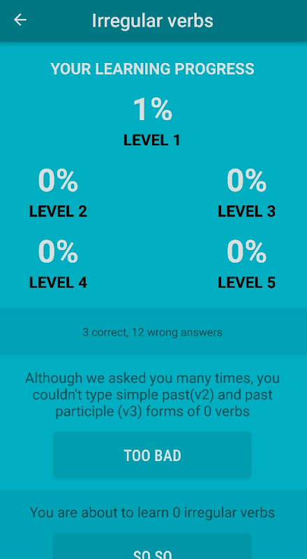 В данном приложении собраны все неправильные глаголы английского языка, сумма которых составляет 255! Совершенствуйте и изучайте неправильные глаголы в интересной форме, следите за своим прогрессом и всё это без всякой надоедливой рекламы абсолютно бесплатно!