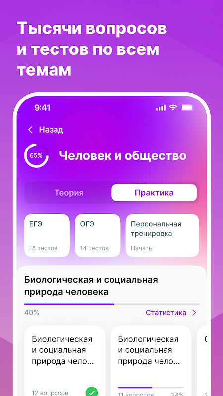 Ứng dụng này rất lý tưởng để chuẩn bị cho Kỳ thi Nhà nước Thống nhất và Kỳ thi Nhà nước Thống nhất về nghiên cứu xã hội. Toàn bộ lý thuyết được chia thành các chủ đề và phần, ví dụ, con người và xã hội, kinh tế và quan hệ xã hội. Mỗi văn bản, bài viết đều được bổ sung bằng thực hành: bài tập, bài kiểm tra để kiểm tra, củng cố kiến thức.