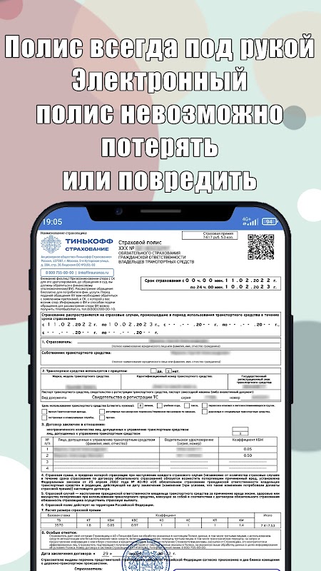 Bạn không cần phải mang theo hợp đồng giấy tờ bên mình nữa! Chỉ cần trình bày chính sách OSAGO từ màn hình điện thoại là đủ, và chính cảnh sát giao thông sẽ kiểm tra mức độ phù hợp của bảo hiểm ô tô dựa trên PCA. e-OSAGO thuận tiện để sử dụng khi đăng ký tai nạn theo Europrotocol trong ứng dụng State Services.Auto. Định dạng e-mail các chính sách có sẵn trên toàn lãnh thổ Liên bang Nga.