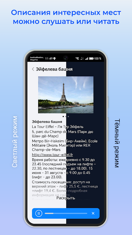 Được lồng tiếng chuyên nghiệp bằng tiếng Nga. Nghe những câu chuyện trong khi khám phá các điểm tham quan—tiện lợi, an toàn và bổ ích.
