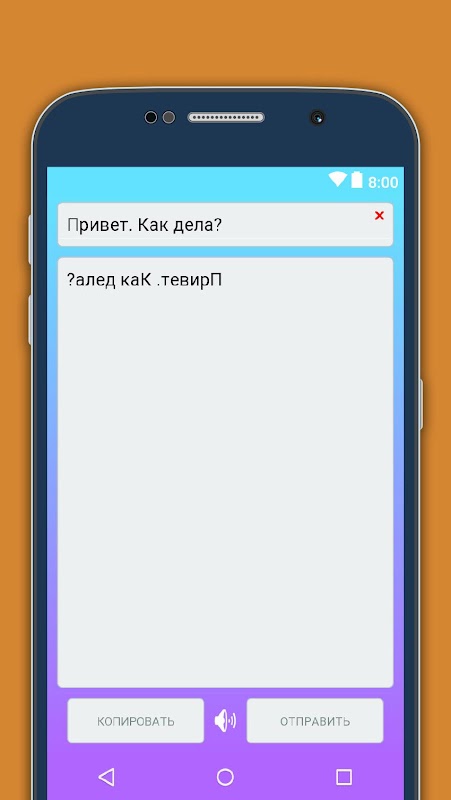 Приложение перевернет задом наперёд набранный текст. Перевернутый текст можно скопировать в буфер обмена или одним кликом отправить его в другое приложение кому-нибудь в виде сообщения.
