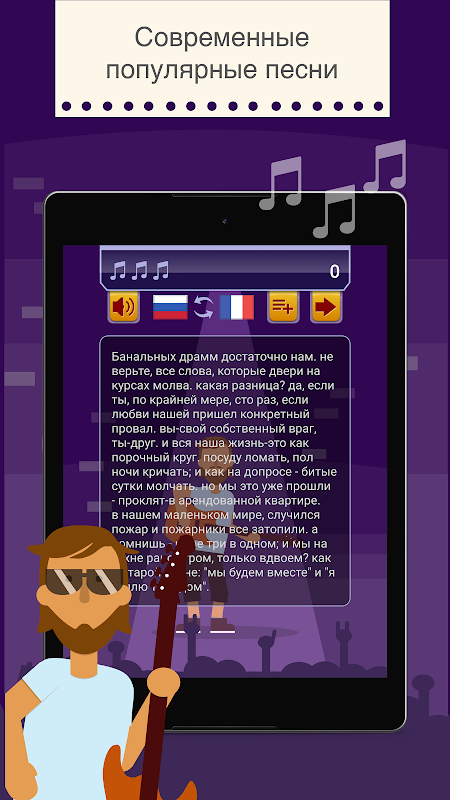 Một trò chơi âm nhạc trong đó bạn cần đoán những bài hát mà lần đầu tiên chúng tôi thực hiện bản dịch sang tiếng nước ngoài, sau đó lại chuyển sang tiếng Nga. Trò chơi thú vị này phù hợp cho cả công ty và trò tiêu khiển đơn độc dễ chịu.