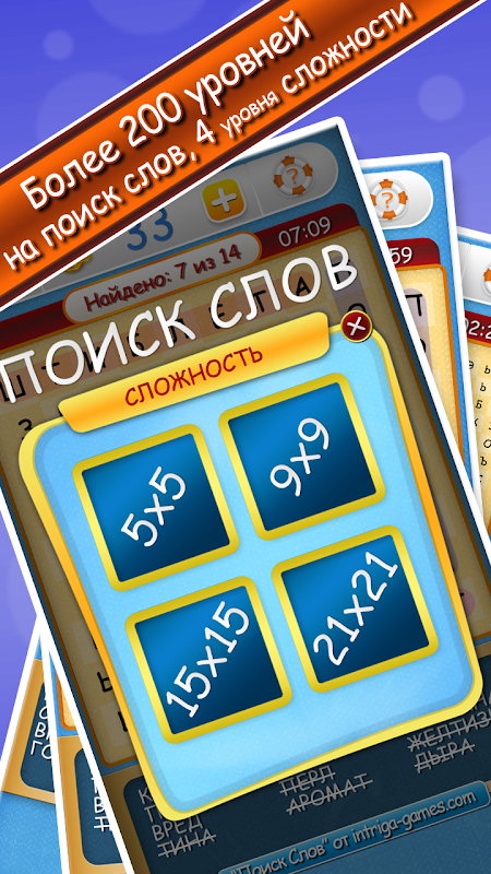 Уровни сложности в поиске слов. Доступны: 5х5, 9х9, 15х15, а также: 21х21. Удобно тем, кто ищет слова на планшетах, компьютерах и ноутбуках.