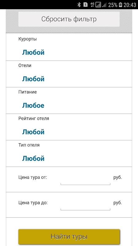 Приложение имеет интуитивно понятный интерфейс. Пользователю нужно только заполнить поля: выбрать направление, класс отеля, тип питания, даты и количество человек.