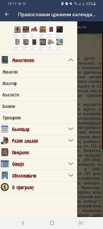 - Chương trình còn có lịch nhà thờ Chính thống với những ngày ăn chay trong năm và cuộc đời của các Thánh - lời mở đầu Ohrid cho mỗi ngày trong năm. Cuộc đời và việc làm của các vị thánh trong Giáo hội Chính thống được mô tả trong cuộc đời của các vị thánh.