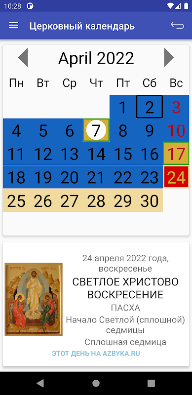 Đối với mỗi ngày, ứng dụng có một liên kết để chuyển đến lịch của cổng ABC of Faith (azbyka.ru).