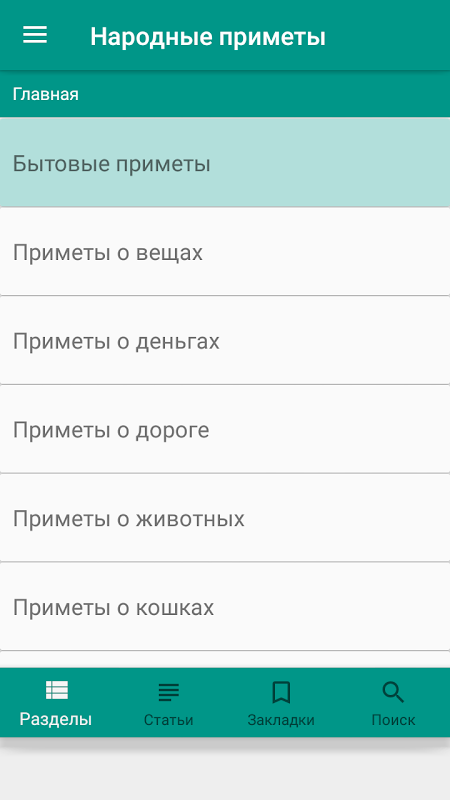 Приметы и суеверия в приложении разделены на следующие разделы: