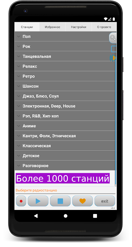 Trong ứng dụng, bạn sẽ tìm thấy hơn 1.500 đài phát thanh thuộc mọi thể loại: Our music, Pop, Rock, Retro, Disco, Dance music, Chanson, Rap, R&B, Hip-hop, Jazz, Electronic, Deep, House, Ethnic, Folk, Relax, Nhạc cổ điển, Talk radio.