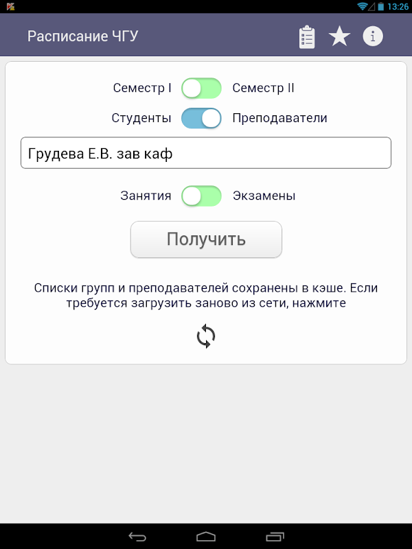 Приложение для преподавателей и студентов ЧГУ (Череповецкого государственного университета) упрощающее поиск и просмотр расписаний занятий и экзаменов.