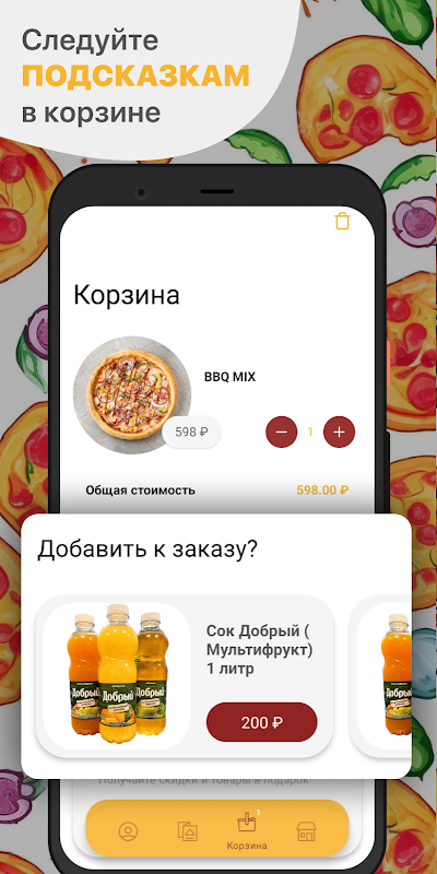Cách đặt hàng trong ứng dụng “Pizza tròn”: chọn các món bạn thích từ menu, thêm chúng vào giỏ và chuyển đến màn hình thanh toán (bằng cách nhấp vào biểu tượng giỏ).