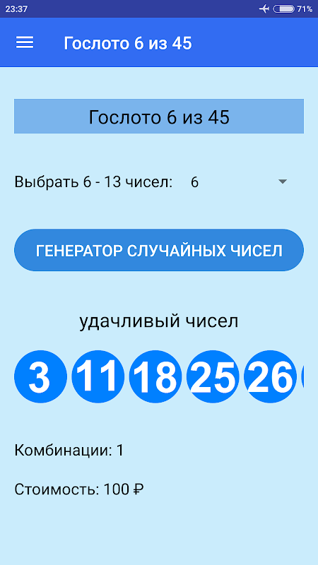 С помощью этого бесплатного приложения вы можете выбрать случайные числа для игр Гослото 6 из 45, Гослото 5 из 36, Гослото 4 из 20, Гослото 7 из 49, Спортлото Матчбол и каждый игра-лотерея.