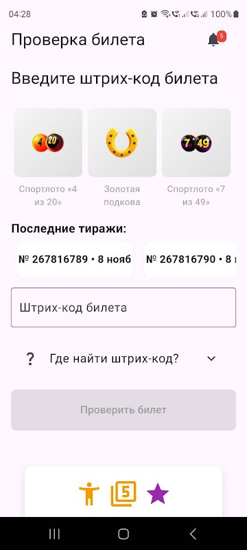 Ứng dụng hỗ trợ xác minh tức thì, mang đến cơ hội tìm hiểu kết quả chỉ sau vài cú nhấp chuột. Ở đầu màn hình có tiêu đề “Kiểm tra vé” và trường nhập dữ liệu, bên dưới có các biểu tượng của các loại xổ số phổ biến như Sportloto và Golden Horseshoe, là giải pháp lý tưởng cho những ai thường xuyên chơi xổ số Nga Lotto.