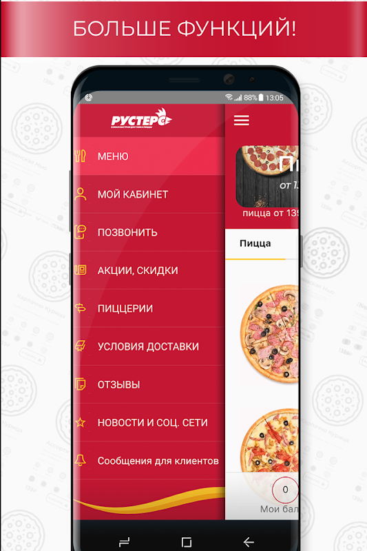 Доставка пиццы в Волгограде займет не более 60 минут, а сам заказ — всего несколько нажатий! Рустерс подарит вам пиццу если не успеет вовремя. Установи, тебя ждут сотни аппетитных блюд: