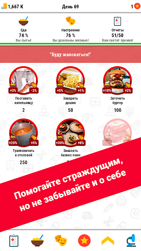 Giúp đỡ những người đau khổ, nhưng đừng quên chính mình - pha một cú doshik đúng giờ, đi xem phim và đạt được sự tín nhiệm! Khám phá tất cả những thành tựu của một bác sĩ mô phỏng, trở thành bác sĩ có thẩm quyền nhất và phát minh ra phương thuốc cho tất cả các bệnh và thuốc cho tuổi già)