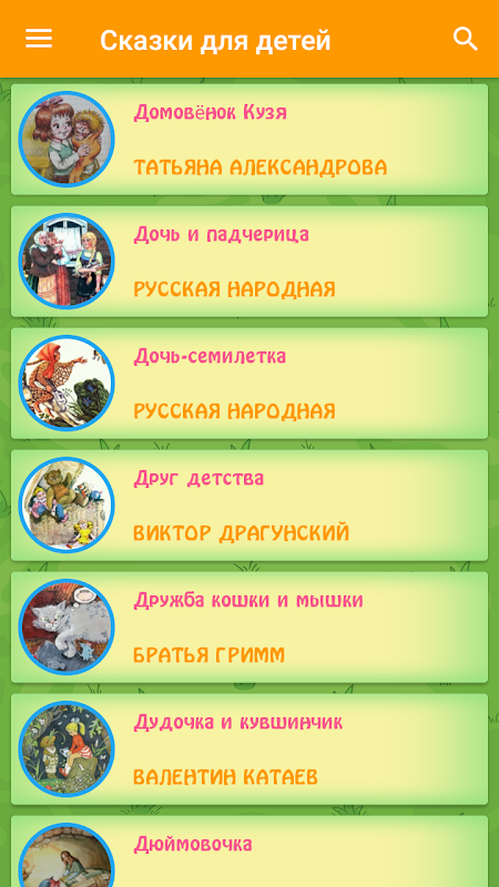 Приложение Сказки для детей содержит большое количество русских народных сказок, а также зарубежные сказки.