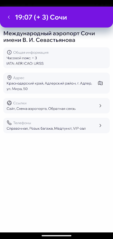 Thông tin về các chuyến bay của sân bay thành phố Sochi (Adler), thời gian đi hoặc đến