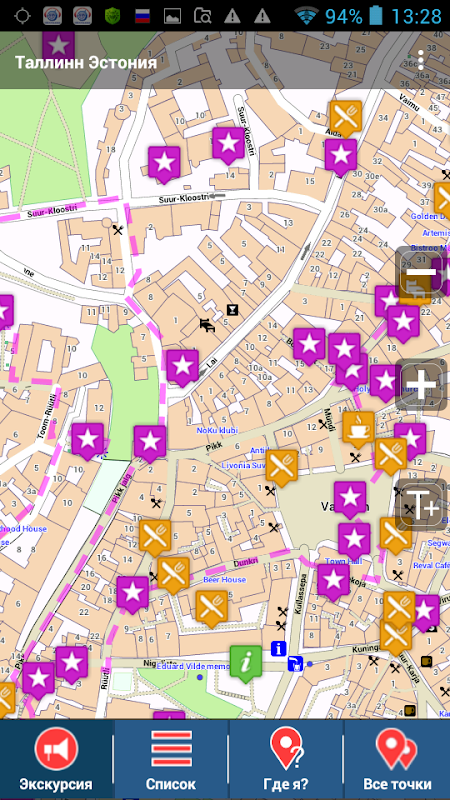 ● ĐI BỘ Ở TALLINN. Chúng tôi cố tình tránh đăng nhiều tuyến tham quan trong hướng dẫn Tallinn của mình, vì toàn bộ Phố cổ là một bảo tàng ngoài trời rộng lớn. Dạo quanh các con phố của Phố cổ, dạo qua Công viên Kadriorg và ghé thăm những địa điểm đẹp nhất ở quận Pirita. Hướng dẫn sẽ luôn làm nổi bật những điều thú vị nhất. Hãy tự tạo kế hoạch đi bộ Tallinn của riêng bạn bằng cách chọn những địa điểm mong muốn trong danh mục, và chúng sẽ ngay lập tức xuất hiện trên bản đồ. Bạn cũng có thể dễ dàng xóa các đối tượng khác khỏi bản đồ.